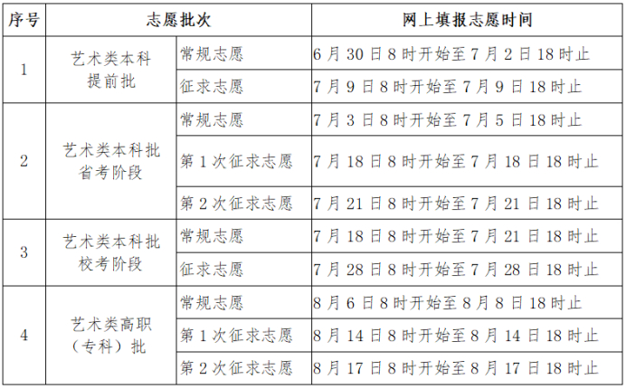 艺术类本科提前批常规志愿和征求志愿以及本科批校考阶段实行符合投档条件考生全部投档模式。本科批省考阶段常规志愿和征求志愿与高职(专科)批常规志愿和征求志愿均按考生艺术类综合分实行专业平行志愿投档模式。