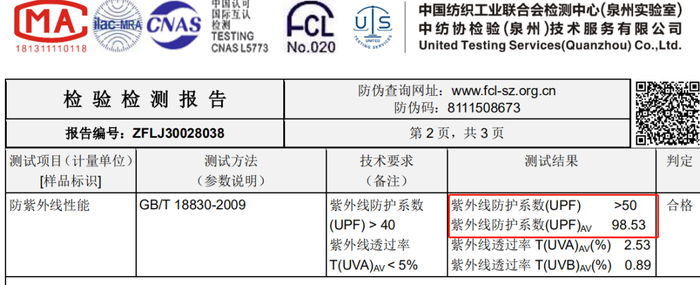 2010 年开始实施的国标 GB/T 18830 - 2009《纺织品防紫外线性能的评定》中显示,只有当 UPF > 40 时,长波紫外线透过率小于 5%,才能认为这种产品防紫外线。