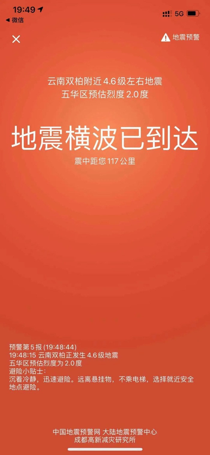 原标题:楚雄双柏发生4.6级地震!昆明网友收到预警