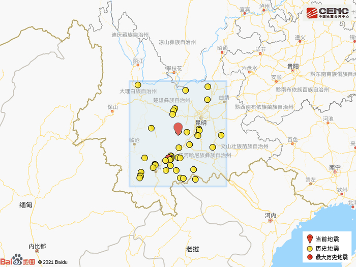 历史地震:根据中国地震台网速报目录,震中周边200公里内近5年来发生3级以上地震共67次,最大地震是2018年9月8日在云南普洱市墨江县发生的5.9级地震(距离本次震中120公里),按震级大小前50次历史地震分布如图。