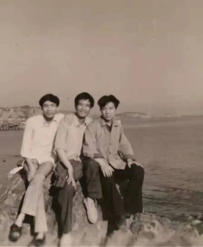 1982年,唐本忠(中)在大连外国语学院培训班学习日语时与同学在海边合影。(资料照片)