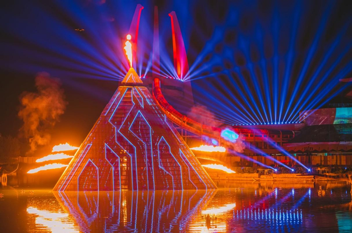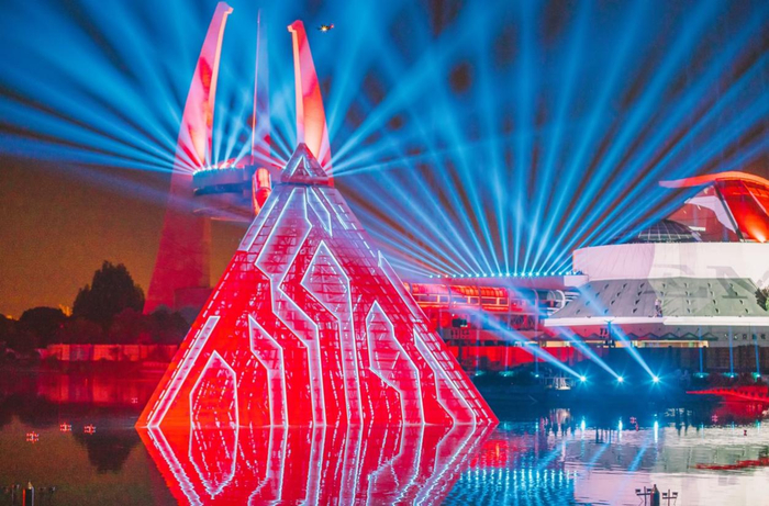 为打造全方位的沉浸式效果,《D秀》团队历时一年多的技术研发,以数字多媒体声光演艺为主要手段,以中华恐龙馆为核心,对周围的空间格局、观演环境等进行了全方位的考量。在精心挑选的位置上新增了数百个全新的灯光效果装置,力求从观众入场开始,就能够根据故事节奏设置,营造不同的现场氛围,并能够配合剧情发展,带来进一步升级的观赏感受。据悉,为《D秀》特别定制的水中升降三维立体数字光影装置也会在当天亮相,这将成为此次大秀的点睛之笔。