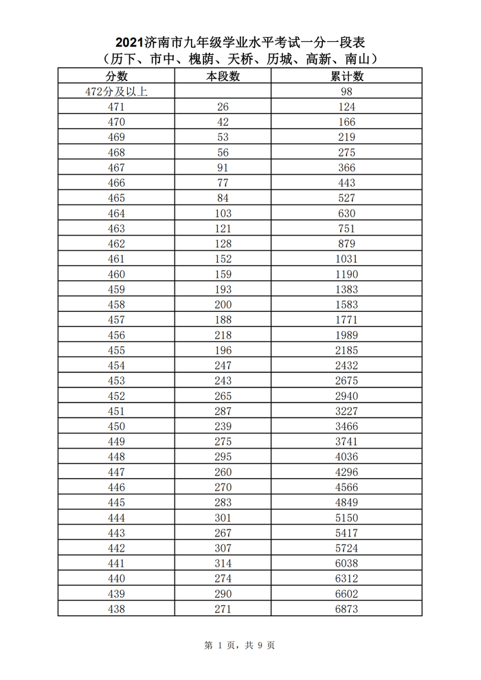 为方便考生填报志愿,中招办在公布各类志愿填报资格线的同时,公布全市(不含莱芜区、钢城区)及市内七区(历下、市中、槐荫、天桥、历城、高新、南山)九年级学业水平考试一分一段表。