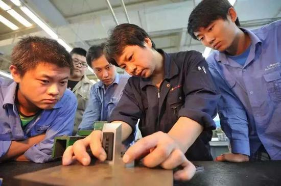 ▲大国工匠、中国航天科工三院33所巩鹏在车间与同事研究加工技术。