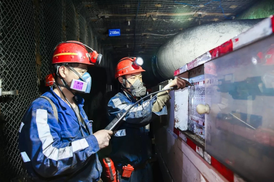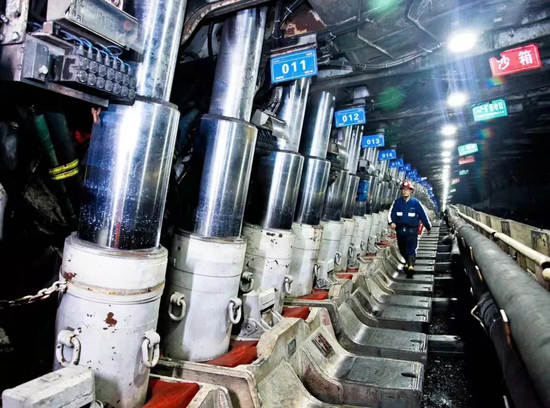 ▲在地下几百米深的采煤现场,数百根液压支架像擎天柱一样牢固支撑起采煤工作面,有效保障井下作业安全。