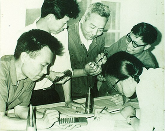 ▲原066基地型号总师王振华(左一)与同事在简陋的条件下进行型号研制