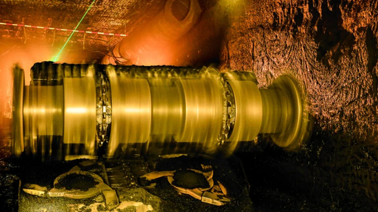 ▲这是全球首套全断面高效快速掘进系统,装备于神东煤炭集团的矿井,每分钟可向前掘进0.3米,每月的掘进速度可达7000米。