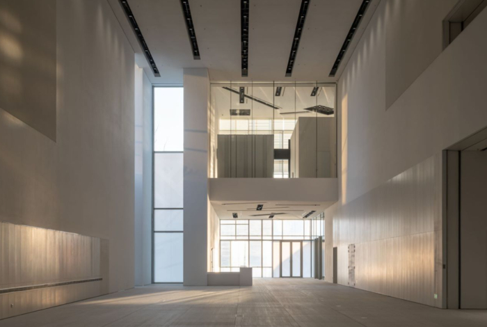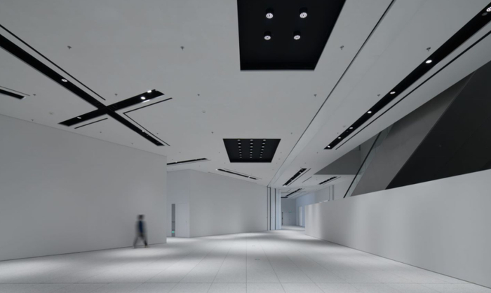 中央展厅X是一个实验性的当代艺术展厅,从地下一层直插顶层,为17米×17米的底面、34米高的竖向空间,内置一个长宽为6.5米的升降展台。顶部有自然天光射入,也可把天光遮盖,做成一个黑盒子。