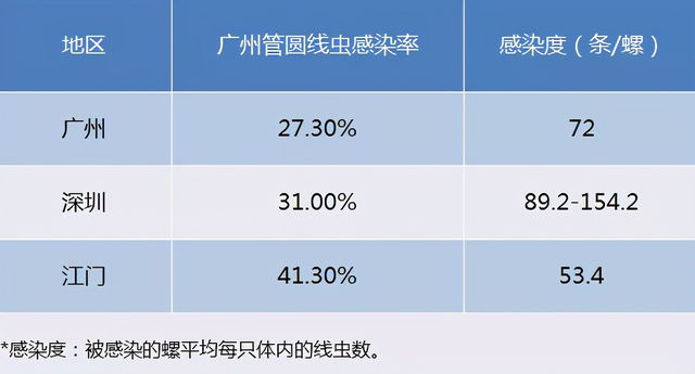 在深圳,广州管圆线虫的感染率为31.0%,感染度为介于89.2-154.2条/螺。