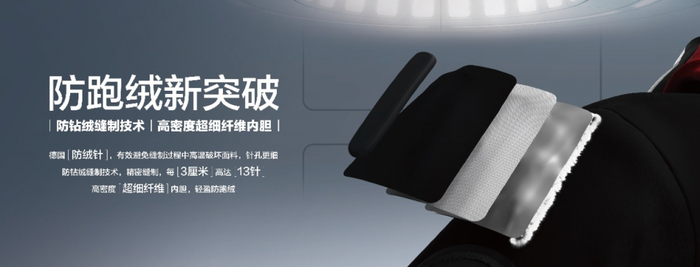 针对行业普遍存在的羽绒服钻绒问题,波司登潜心研究,采用德国防热机针有效避免缝制过程中高温破坏面料,采用150D丝光线、603缝纫线或21Tex缝纫线,缝纫线将机针留下的针孔充分填满,使每一件产品高密锁绒。但波司登并没有把这项技术“私藏”,而是积极将技术开放并进行全行业推广,推动行业共同进步。极大缩小了与国际技术水平差距。