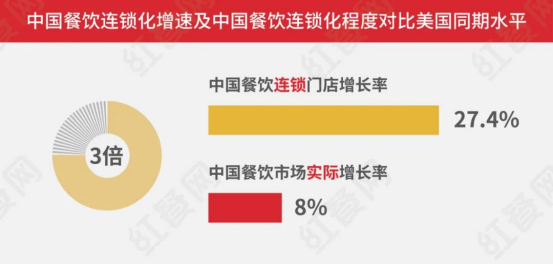 有相关数据统计显示,中国连锁化率从2018年底的12%,已经达到2020年底的15%,而且2019年中国餐饮连锁门店增长率达到27.4%,3倍于餐饮的整体增长率。