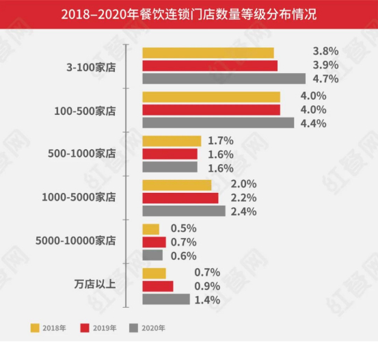 相关数据显示,3-100家门店的餐企占比,从2018年的3.8%,到2019年的3.9%,再到2020年的4.7%,增幅分别为0.1%、0.8%,而同样时间的100-500家门店餐企占比,增幅仅为0、0.4%。