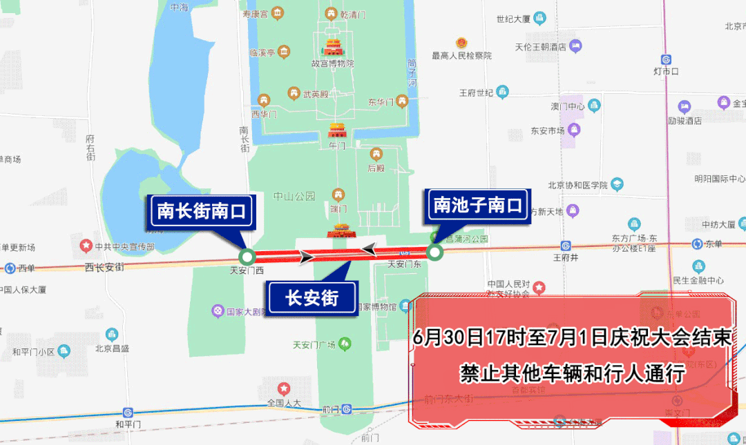 6月30日17时至7月1日庆祝大会结束,长安街由南长街南口(不含)至南池子南口(不含)双方向路段,除持有庆祝大会专用证件的车辆和人员外,禁止其他车辆和行人通行。