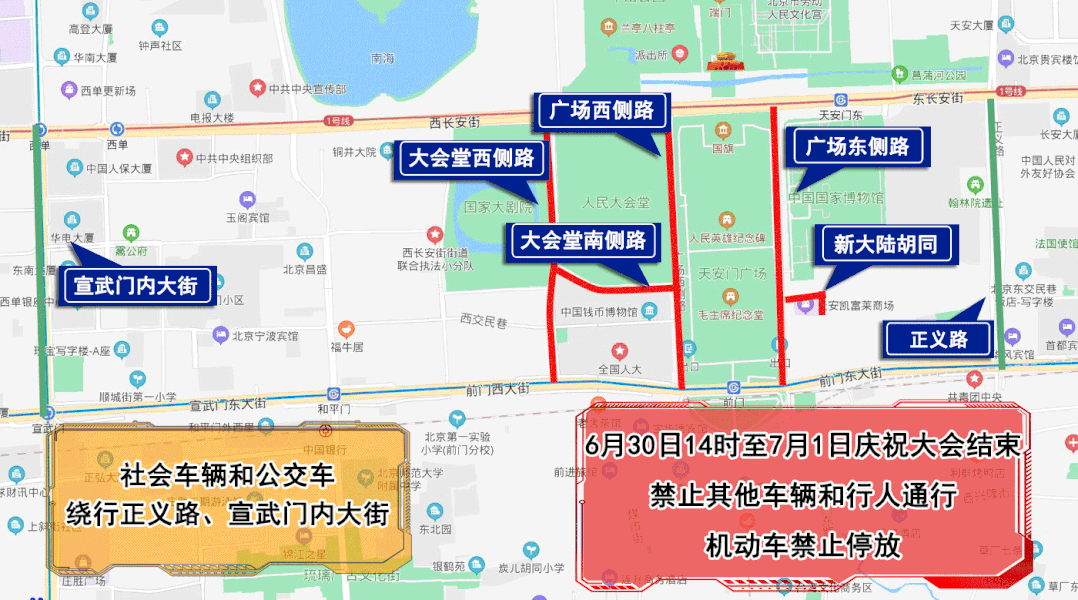 6月30日21时至7月1日庆祝大会结束,由府右街北口经府右街、长安街、西单路口(不含)、宣武门内大街(不含)、宣武门路口(不含)、宣武门东大街、前门西大街、煤市街、珠市口西大街(不含)、珠市口东大街(不含)、前门东路、前门东大街、崇文门西大街、崇文门路口(不含)、崇文门内大街、东单路口(不含)、东单北大街、金鱼胡同、东安门大街、北河沿大街、五四大街、景山前街、景山东街、景山后街、景山西街、景山前街、文津街至府右街北口以内区域、西单横二条、祈年大街、东打磨厂街、南新华街、香炉营头条、草厂三条、前门肯德基停车场,除持有庆祝大会专用证件的车辆和人员外,禁止其他车辆和行人通行。社会车辆和公交车经宣武门内大街、平安大街、两广路绕行。