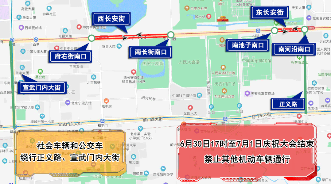 6月30日17时至7月1日庆祝大会结束,西长安街由府右街南口(不含)至南长街南口(不含)、东长安街由南河沿南口(不含)至南池子南口(不含)双方向路段,除持有庆祝大会专用证件的车辆外,禁止其他机动车辆通行。社会车辆和公交车经正义路、宣武门内大街绕行。