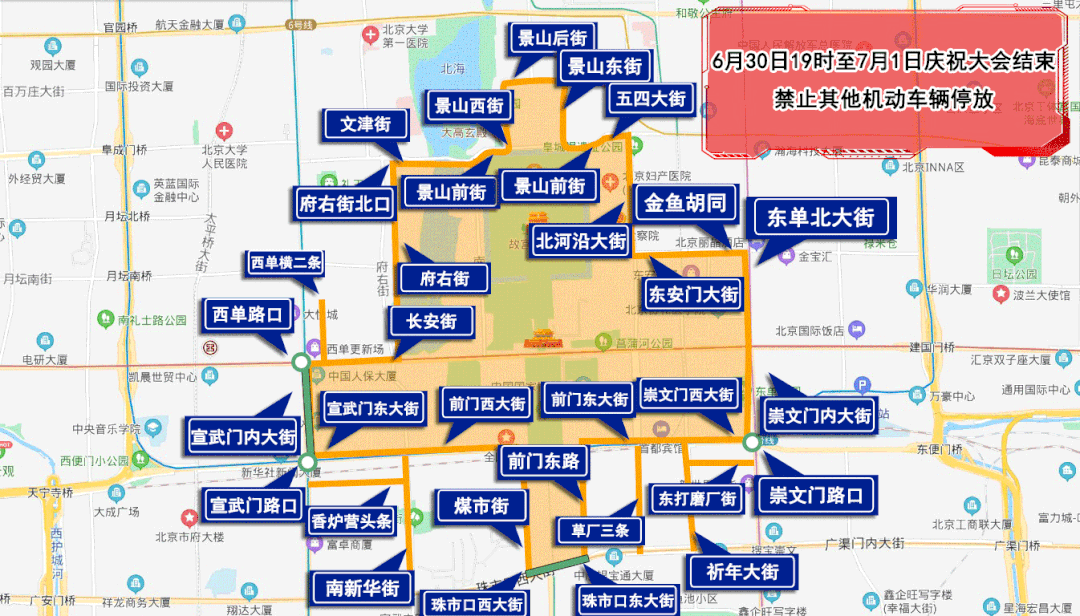 6月30日19时至7月1日庆祝大会结束,由府右街北口经府右街、长安街、西单路口(不含)、宣武门内大街(不含)、宣武门路口(不含)、宣武门东大街、前门西大街、煤市街、珠市口西大街(不含)、珠市口东大街(不含)、前门东路、前门东大街、崇文门西大街、崇文门路口(不含)、崇文门内大街、东单北大街、金鱼胡同、东安门大街、北河沿大街、五四大街、景山前街、景山东街、景山后街、景山西街、景山前街、文津街至府右街北口以内区域、西单横二条、祈年大街、东打磨厂街、南新华街、香炉营头条、草厂三条、前门肯德基停车场,除持有庆祝大会专用证件的车辆外,禁止其他机动车辆停放。