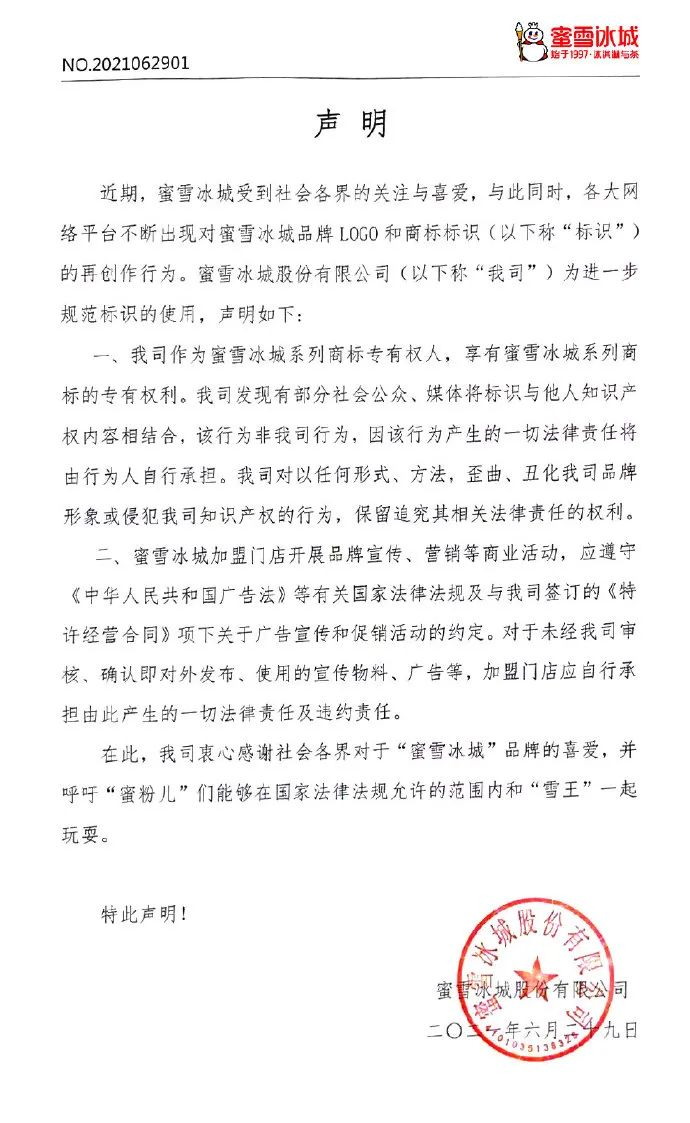 6月30日下午,蜜雪冰城在其官方微博发布声明称,近期,各大网络平台不断出现对蜜雪冰城品牌LOGO和商标标识的再创作行为。我司对以任何形式、方法,歪曲、丑化我司品牌形象或侵犯我司知识产权的行为,保留追究其相关法律责任的权利。(每日经济新闻)