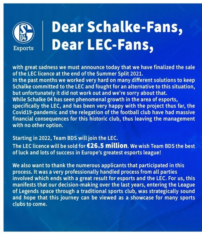 在此背景下,今年初就有消息称沙尔克04队正在寻求买家出售S04战队及LEC席位。在S04战队出售公告中称:“非常遗憾我们今天必须宣布已经完成在2021年夏季赛末出售LEC席位的协议,过去几个月我们努力以不同的方式保留沙尔克04的LEC席位,但是很抱歉未能成功。”