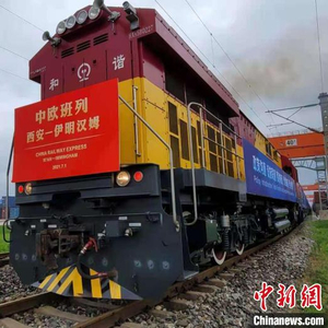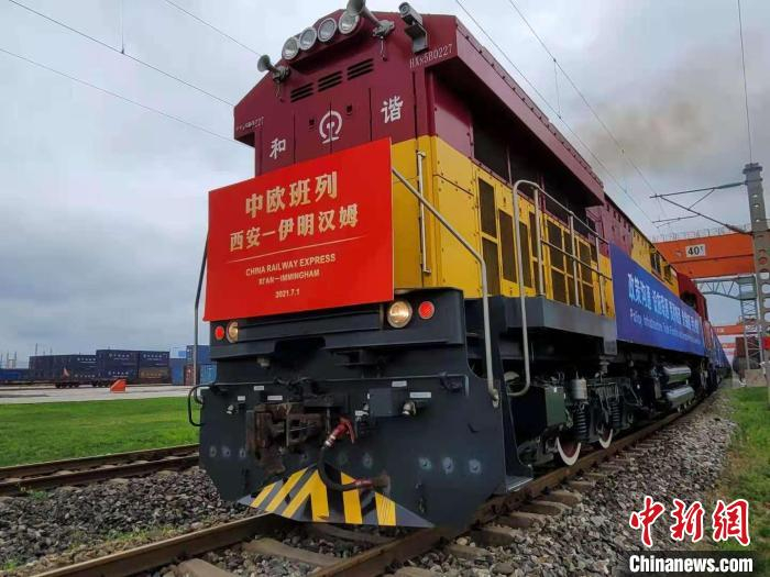 中新网西安7月1日电 (记者 阿琳娜)1日,满载50个集装箱货物的中欧班列长安号(西安–伊明汉姆)驶出西安国际港站,奔向英国。中欧班列长安号(西安–伊明汉姆)开行,将成为一条从西安直通英国的“黄金干线”。