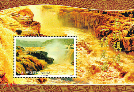 2002年11月8日,中国邮政发行了编号为2002-21的《黄河壶口瀑布(金箔小型张)》特种邮票1枚,面值8元。邮票小型张图案中,壶口瀑布上印有纯金箔“与时俱进·一往无前”的字样。