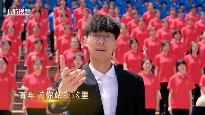 石家庄邮电职业技术学院版《岁月征程》MV中钟松霖演唱画面。