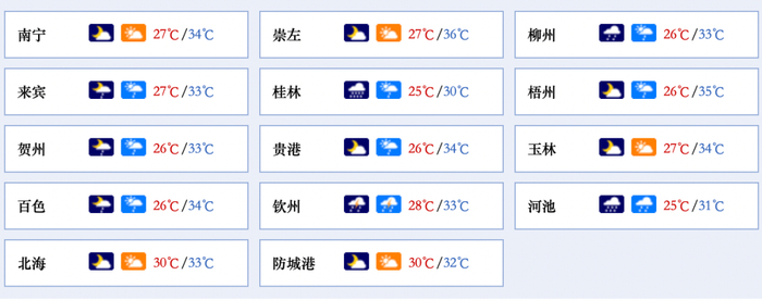 南宁市:多云,东南风1~2级,最低气温27℃,最高气温34℃。