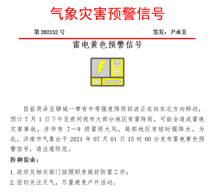 济南市气象局发布雷电黄色预警信号。