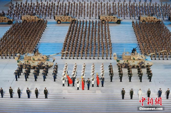 6月28日晚,庆祝中国共产党成立100周年文艺演出《伟大征程》在国家体育场盛大举行。图为情景歌舞《强军战歌》。 中新社记者 韩海丹 摄