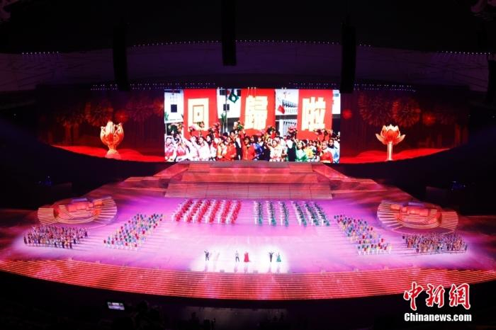 6月28日晚,庆祝中国共产党成立100周年文艺演出《伟大征程》在国家体育场盛大举行。图为情景合唱与舞蹈《回归时刻》。 中新社记者 韩海丹 摄