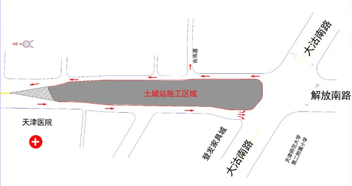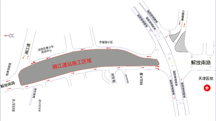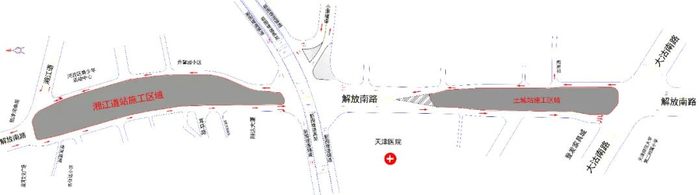 交管部门表示,土城站、湘江道站主体施工将主要占用解放南路(天津医院至大沽南路段、围堤道至湘江道段)道路。施工期间,施工区域将新建导行路供过往车辆通行。其中,北向南方向将设置2条机动车道、1条非机动车道和1条人行道;南向北方向设置1条机非混行车道及1条人行道。同时,与施工区域相邻的解放南路与大沽南路交口、解放南路与围堤道交口、解放南路与湘江道交口、洪泽西路与台儿庄路交口交通组织将进行优化调整。