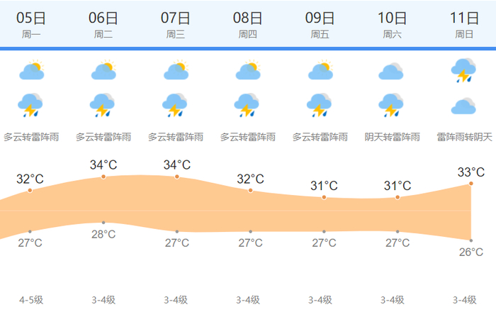 7月5日起,上海处在副热带高压和梅雨带边缘,雨水不似这两日“绵长”,以多云午后有短时雷阵雨天气为主,气温也会明显上升,下周中期极端最高气温可达34℃附近,其余日子里最高气温大多在31~32℃,明显热了不少,最低气温变化相对平稳,在27~28℃之间。