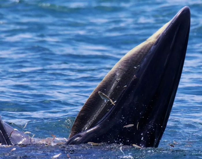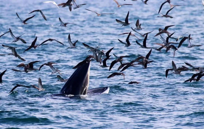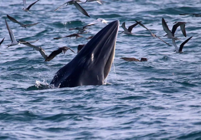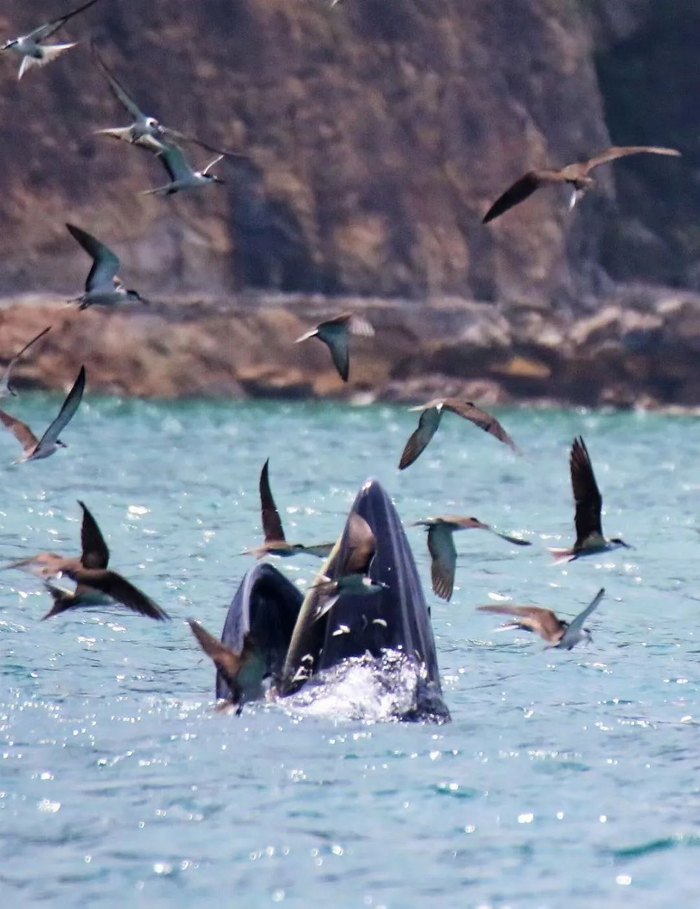 “那是鲸鱼在捕食,露出水面的是它的大嘴,这种捕食行为是布氏鲸独有的。”田正介绍说。