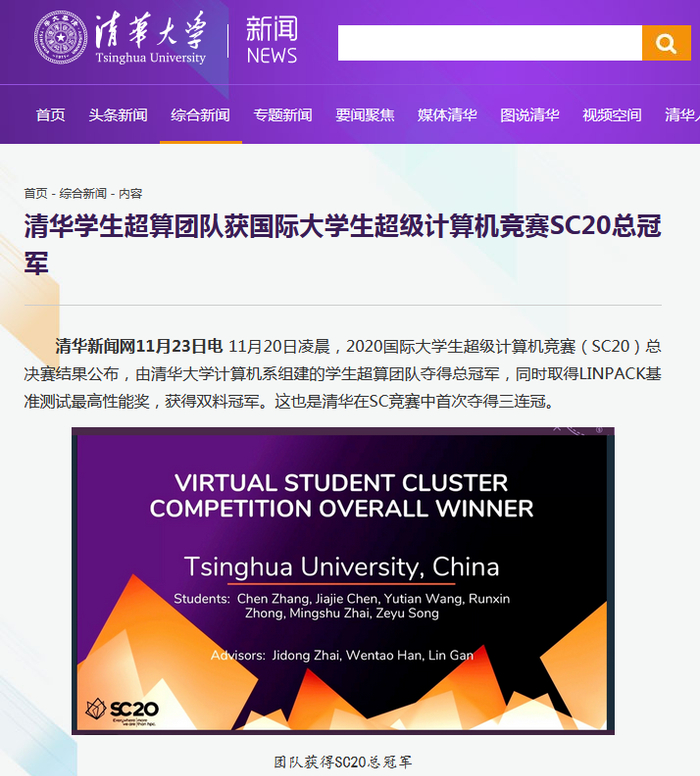 清华大学网站信息显示,2020年11月20日凌晨,2020国际大学生超级计算机竞赛(SC20)总决赛结果公布,由清华大学计算机系组建的学生超算团队夺得总冠军,同时取得LINPACK基准测试最高性能奖,获得双料冠军。这也是清华在SC竞赛中首次夺得三连冠。