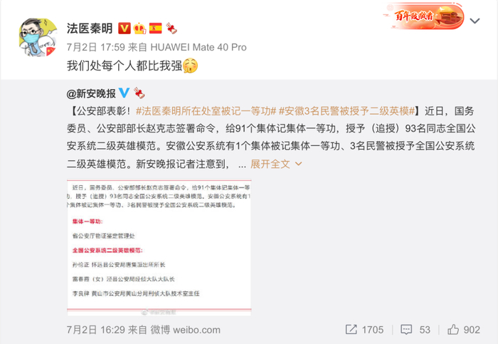 对于所在单位被记集体一等功、登上热搜一位,@法医秦明 微博先是说:“我们处每个人都比我强。”