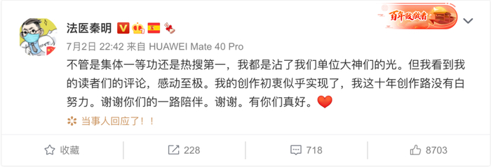 7月2日晚,话题#法医秦明所在单位被记集体一等功#冲上热搜第一。