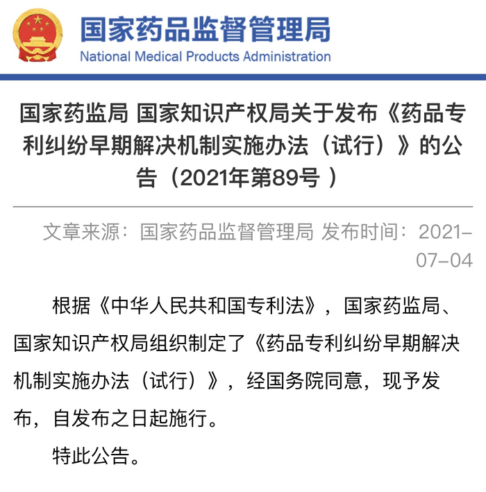 7月4日,由国家药监局、国家知识产权局组织制定的《药品专利纠纷早期解决机制实施办法(试行)》正式施行,该机制将相关药品上市审批程序与相关药品专利纠纷解决程序相衔接,旨在保护药品专利权人的合法权益,降低仿制药上市后专利侵权风险,同时鼓励新药研究和促进高水平仿制药发展。