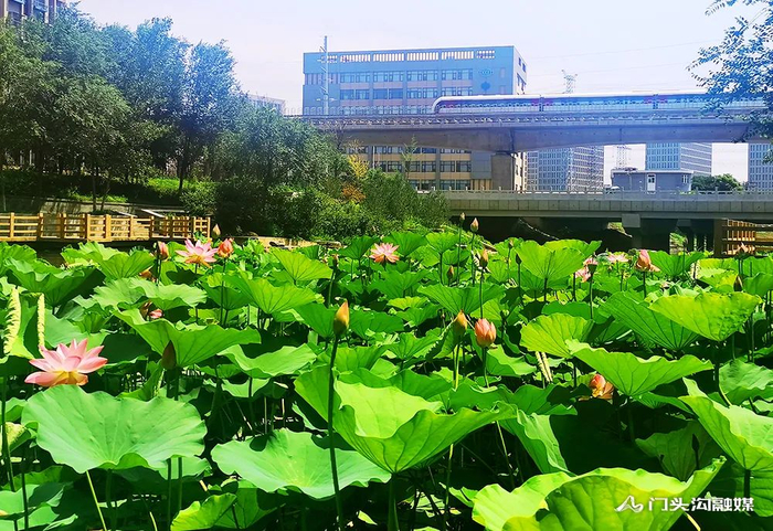 在S1线的高架桥下,西峰寺沟内的荷花已开,花叶清秀,花香四溢。
