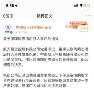 7月4日下午,中国航天科技集团有限公司公开了“关于张陶同志酒后打人事件”的最新通报。该通报称,航天投资控股有限公司党委书记、董事长张陶同志酒后打人事件发生以来,中国航天科技集团有限公司党组高度重视,作出对张陶同志即日起暂停履职、配合调查的决定。