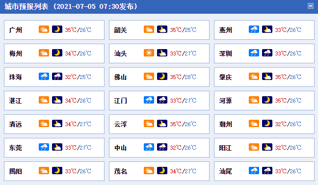 5日,韶关、清远、粤西、珠江三角洲大部市县有分散(雷)阵雨局部大雨,其余市县晴到多云,局部有(雷)阵雨。粤东市县最高气温32~34℃,其余市县34℃~37℃。