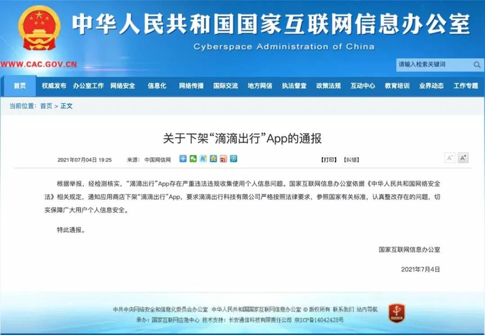 国家网信办4日通报,“滴滴出行”App存在严重违法违规收集使用个人信息问题,通知应用商店下架“滴滴出行”App。