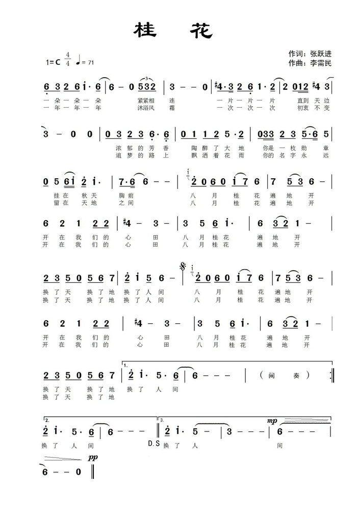 歌曲《桂花》是作者参加省音协组织的赴传统革命歌曲《八月桂花遍地开》诞生地、革命老区、将军县金寨采风后,创作的一首歌曲。