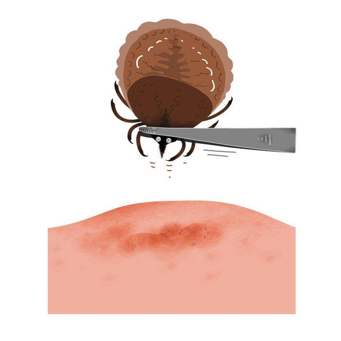 江苏疾控专家提醒,如果到野外郊游、钓鱼或务工,建议穿长衣长裤,袖口、领口、裤腿要扎紧。裸露的皮肤涂抹驱避剂,不仅防蚊还可防止蜱虫叮咬。蜱虫喜欢叮咬在颈部、耳后、大腿根部等皮肤比较薄、不容易被发现的地方。所以如果从以上蜱虫活跃的地点归来,要注意检查这些皮肤褶皱部位。由于蜱的口器会刺入皮肤,叮咬后处理不当,容易将口器留在皮肤内,因此切不可捏、拽、用火或者其他东西刺激它,不建议自行拔除,应及时到附近医院处理。同时,还要密切观察14天内有无发热及其他症状,如出现相关症状应迅速就医并告知医生有蜱虫叮咬史。