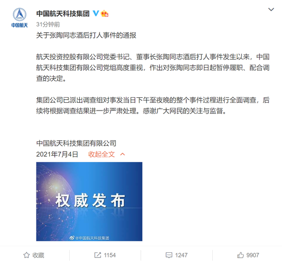 中国航天科技集团有限公司官方微博4日发布通报称,航天投资控股有限公司党委书记、董事长张陶同志酒后打人事件发生以来,中国航天科技集团有限公司党组高度重视,作出对张陶同志即日起暂停履职、配合调查的决定。公告提到,集团公司已派出调查组对事发当日下午至夜晚的整个事件过程进行全面调查,后续将根据调查结果进一步严肃处理。