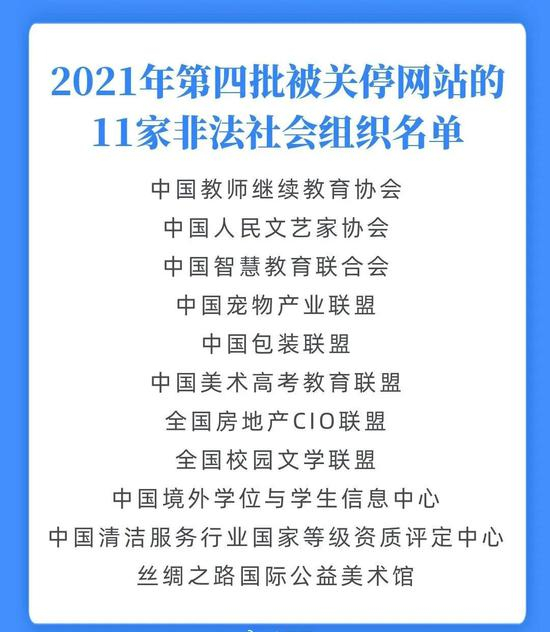 近日,民政部、中央网信办、工业和信息化部,依法关停了2021年第四批11家非法社会组织网站及其新媒体账号,清除了有关关联网页。