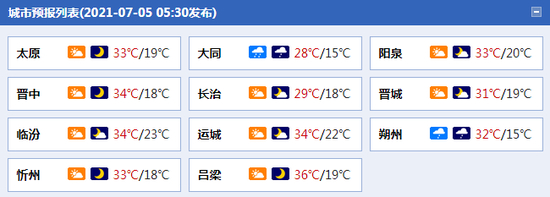 今天夜间到明天白天:全省多云间晴天,大同、朔州、忻州、阳泉、晋中等地的部分地区有阵雨或雷阵雨,大同的局部地区有中雨,并伴有雷暴大风或短时强降水等强对流天气;中部局部和临运盆地的部分地区有35℃以上、临运盆地的局部地区有37℃的高温天气。最低气温:北部及中南部山区14~18℃,中南部其余地区18~24℃;最高气温:北部28~31℃,中南部31~37℃。