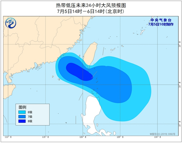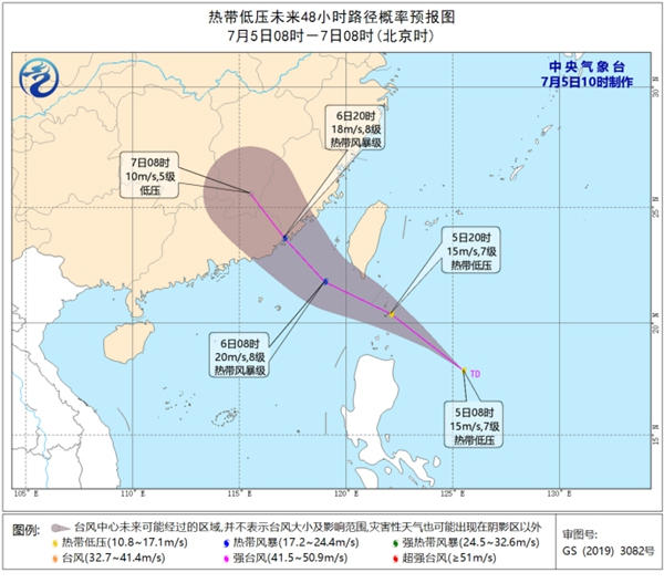 中国天气网讯 中央气象台7月5日上午10点钟发布热带低压预报: