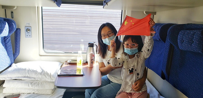 旅客坐在CRH5E长编卧铺动车里,小朋友兴奋的举起国旗。摄影:摆风亮 央广网发