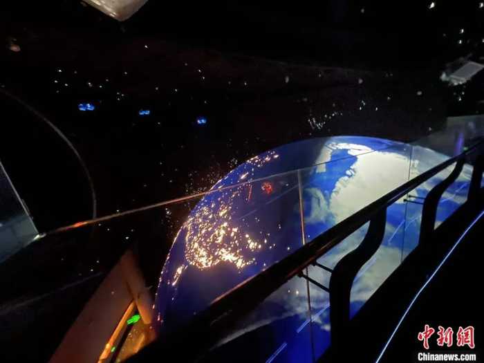 整个展厅最为瞩目的还是要数一个巨大的地球模型。它徐徐自转、昼夜交替,让观众仿佛置身太空,俯瞰这颗蓝色星球。讲解员说,地球模型上的陆地和海洋都在运动,演绎着45亿年间沧海桑田的变化。观众还可以走入地球模型内部,那里是光学天象厅,可以容纳100人。在光学天象厅里,你能看到城市夜晚罕见的璀璨星空,中国人命名的星宿、西方人命名的星座,都在这片模拟星空中一一呈现,教你辨认群星。