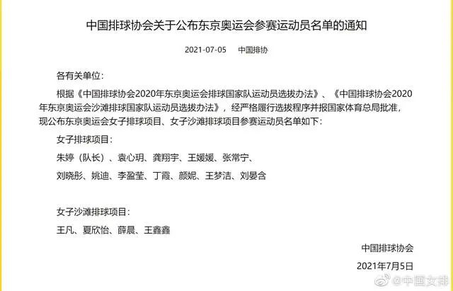 7月5日下午,中国排协网站公布中国女排东京奥运12人参赛名单。朱婷担任球队队长,张常宁、李盈莹和刘晓彤为球队主攻,颜妮、袁心玥和王媛媛组成副攻,龚翔宇、刘晏含担任接应,二传为丁霞和姚笛,自由人由王梦洁担纲。