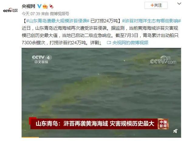 近日,山东青岛近海海域再次遭受浒苔侵袭。据监测,当前黄海海域浒苔灾害规模已创历史最大值,当地已启动二级应急响应。截至7月3日,青岛累计出动船只7300余艘次,打捞浒苔约24万吨。(央视网)
